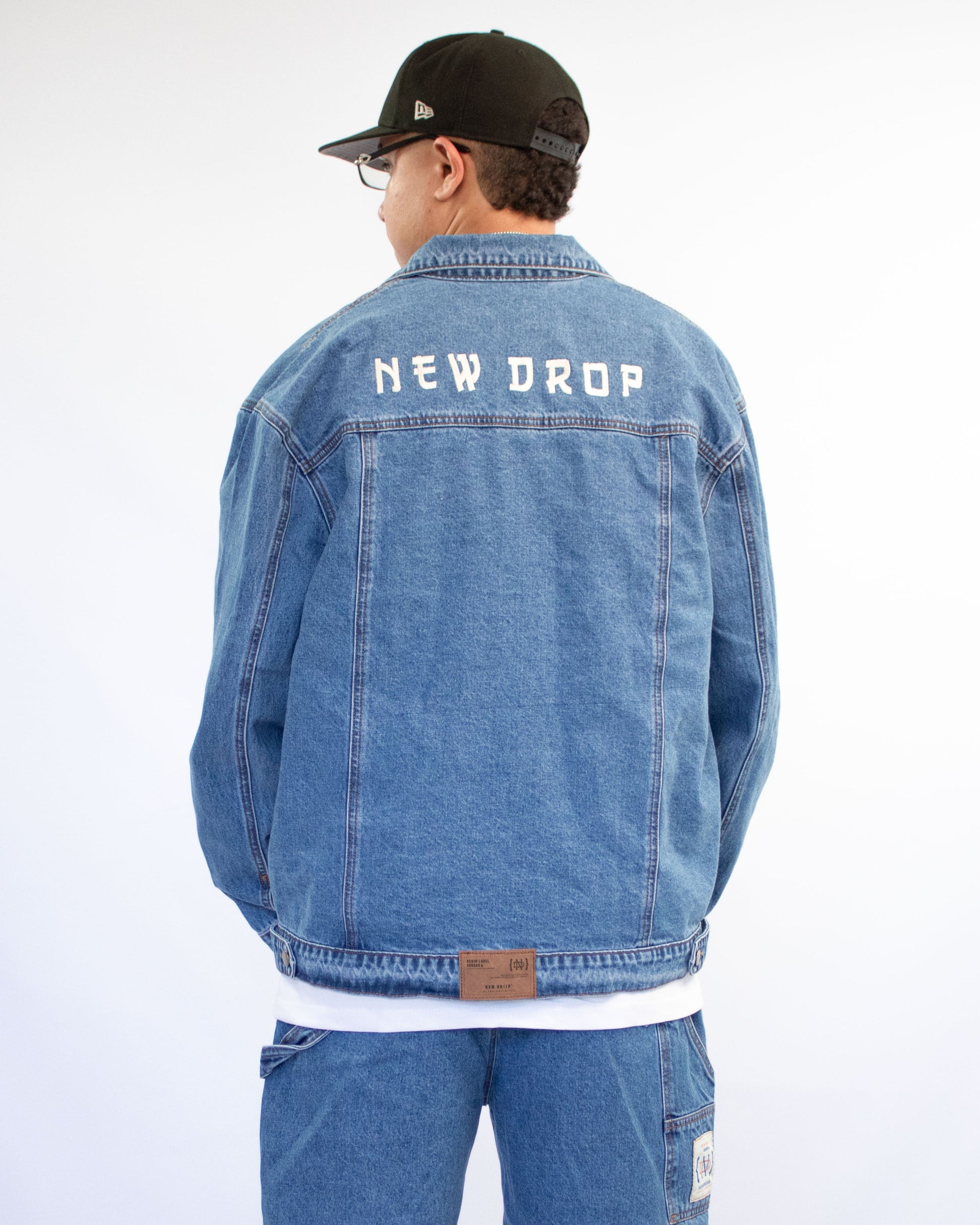 CHAQUETA COLOR BLEACHE BLUE MOLDE OVERSIZED, elaborado en tela 100% algodón (12,5 onz) intervenida con bordado color off White en almilla posterior.