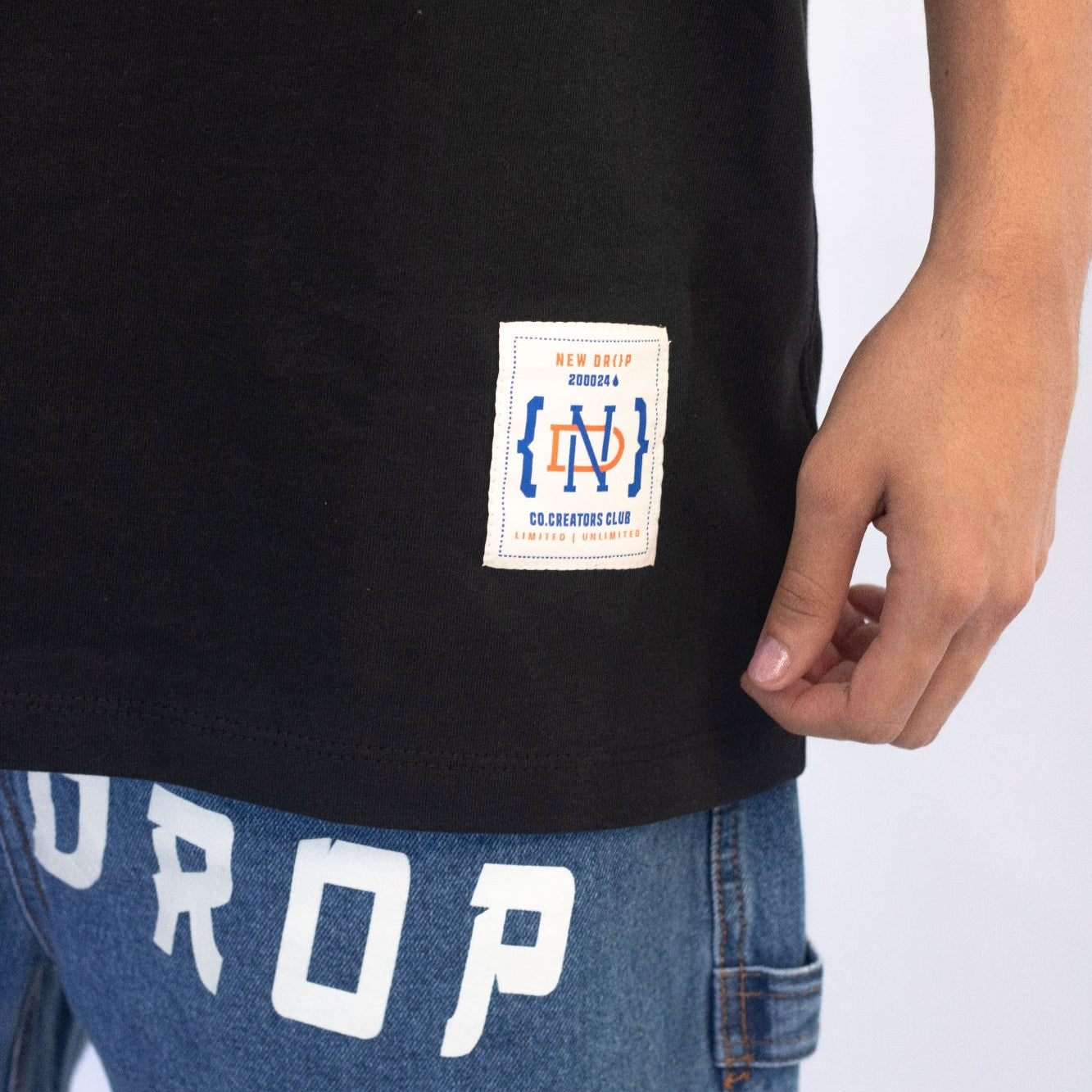 Detalles textiles: bandera de marca tejida, marquilla de talla satinada, instrucciones de lavado, garra de marca tejida.