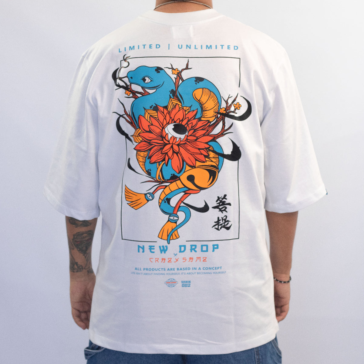 CAMISETA DE MOLDE OVERSIZED, elaborado en tela 100 % algodón de alto gramaje (270 gr) intervenida con estampado en serigrafia a 5 colores, combinado con plastisol plano color azul en frente.