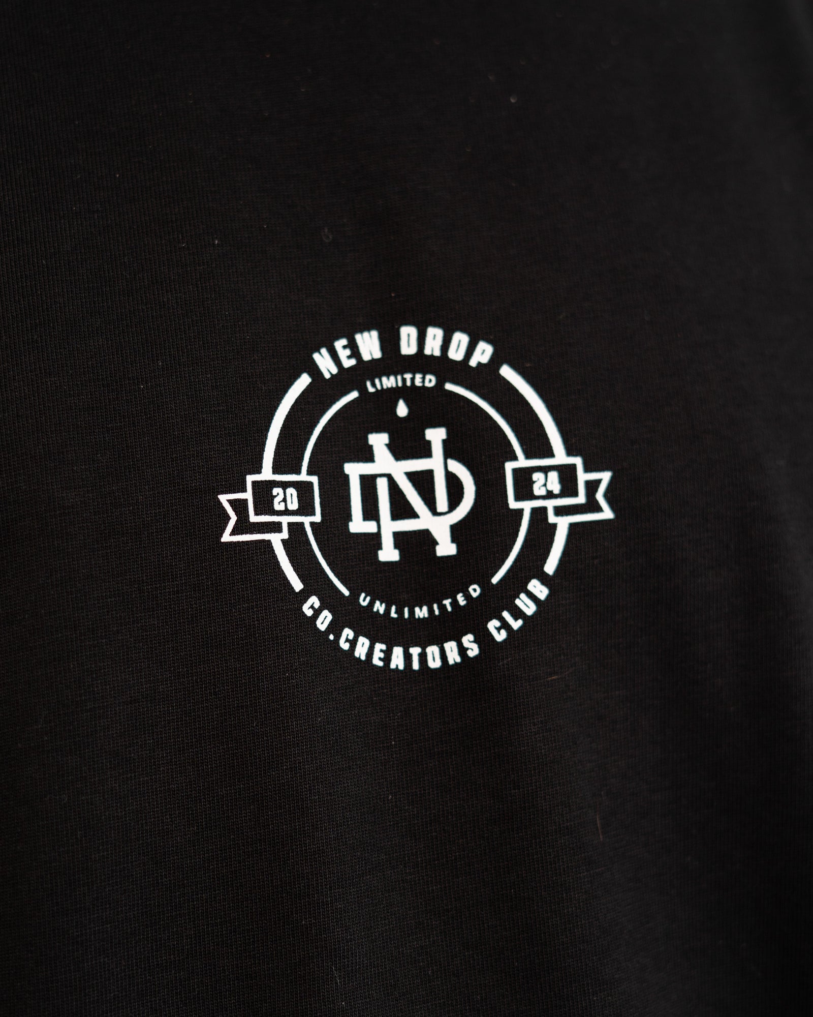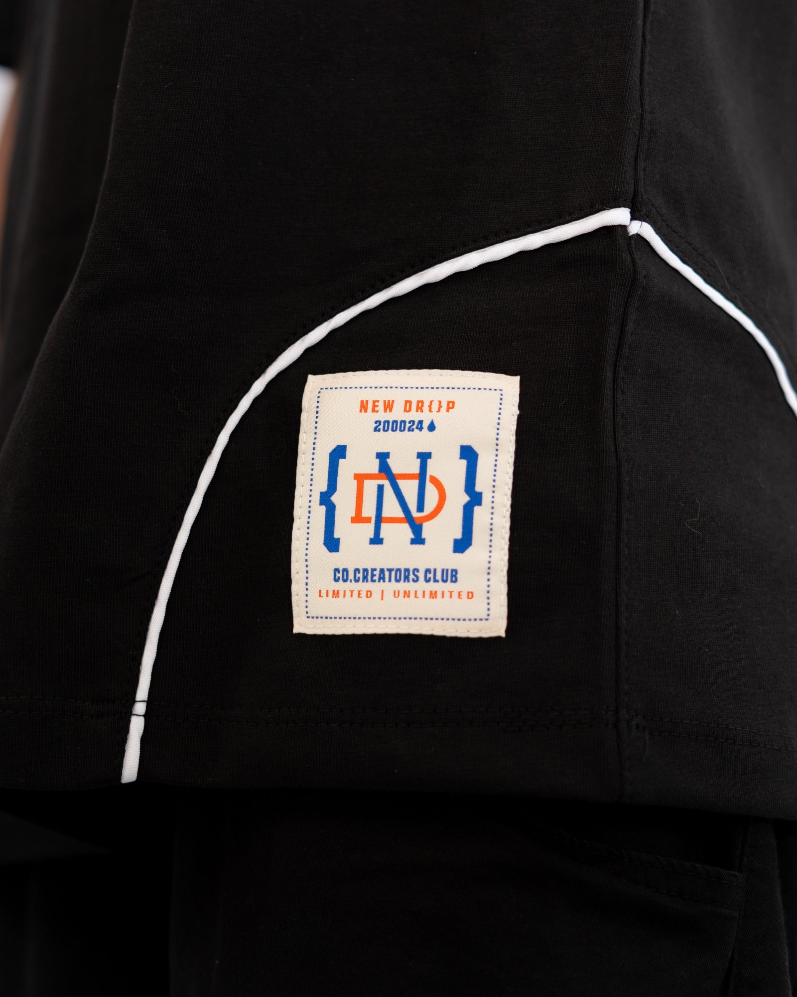 CAMISETA DE MOLDE OVERSIZED, elaborado en tela 100 % algodón de alto gramaje (270 gr) con múltiples cortes unidos con sesgo envivado color contraste e intervenida con estampado en serigrafia a 1 color, combinado con plastisol plano color blanco en frente.